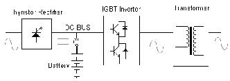 早期大中型UPS主回路結(jié)構(gòu)采用可控硅整流將輸入的交流電整為直流,電池直接掛在直流母線上,當(dāng)輸入市電正常時,靠整流可控硅的調(diào)節(jié)對電池充電,同時為GTR或IGBT結(jié)構(gòu)的橋式逆變器供電,逆變器將直流逆變?yōu)榻涣,最后?jīng)過輸出變壓器的升壓及濾波,提供純正的交流輸出。從其結(jié)構(gòu)中可以看出,從整流(從交流變?yōu)橹绷鳎┑侥孀儯ㄔ趶闹绷髯優(yōu)榻涣鳎┑倪^程中,每個環(huán)節(jié)都是將壓環(huán)節(jié):可控硅整流是為了提供恒定的直流電壓而采取的一種整流方式(可通過可控整流的導(dǎo)通角調(diào)整來適應(yīng)輸入電壓變化,確保輸入交流電壓變化時整流輸出直流電壓的恒定),由于可控硅整流只能斬掉一部分輸入電,所以其恒定輸出電壓的代價是將輸出電壓恒定在底于全波整流輸出電壓的某個數(shù)值上。而逆變環(huán)節(jié)同樣是一個降壓環(huán)節(jié),從可控整流輸入來的直流電在通過逆變器逆變出交流的過程中同樣采用的是斬波的做法,其結(jié)果同樣是輸出電壓等級的再次降低。正是由于上述的原因,在此種結(jié)構(gòu)的UPS中,必須在輸出測加入升壓變壓器,將逆變輸出的較低恒定電壓升致合理的輸出范圍,最終提供了恒定的220/380V輸出。