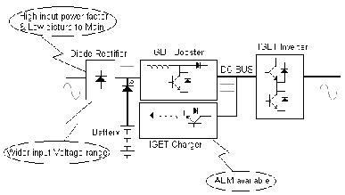 新型全I(xiàn)GBT UPS結(jié)構(gòu)(高頻機)如下,基本結(jié)構(gòu):不控整流+DC/DC倍壓環(huán)節(jié)+獨立充電器+逆變器